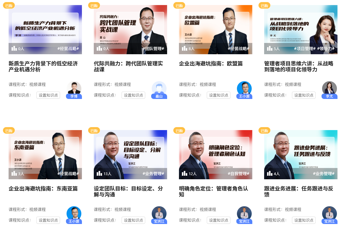 对接第三方优质通用课程超1000门,内容涵盖领导力、职场通用能力、人力资源、市场营销、财务管理、生产管理、产品研发、互联网运营、党建课程、供应链管理、其他课程