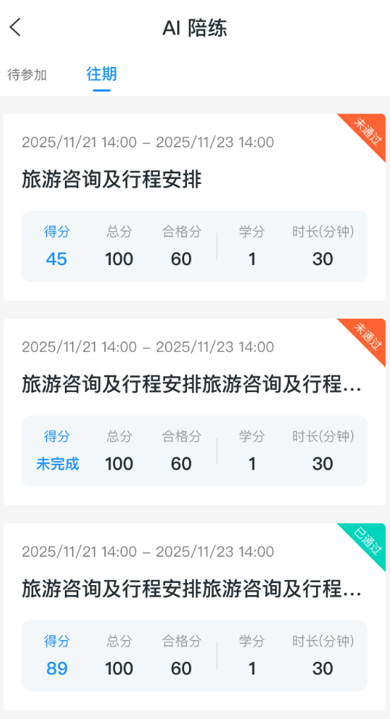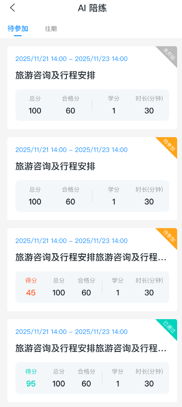 - 进入AI陪练,列表分为待参加和往期。往参加的练习细分为已通过(还可以继续练习)、待参加、未开始;往期的练习分为已通过和未通过。