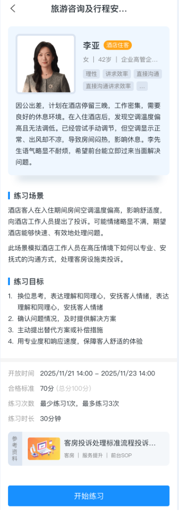 - 进入练习详情后,学员可查看当前练习场景,AI人物设定,开放时间等信息。如果管理员选择第二种方式,并使用系统中的课程和文库作为资料,学员这里可以看到相应信息。管理员允许下,还可以查看练习中需要达到的目标。