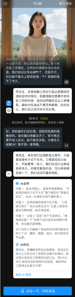 - 进入练习后,学员通过语音对话,和AI人物进行互动,完成话术练习。期间可以使用AI指导进行点评和优化。如轮数用尽也未达到目标,则练习判定为未通过。