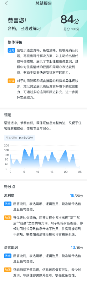 - 如所有环节都达到练习目标,则练习完成,生成数据报告。报告根据设定的评分维度进行评分,需要总分高于合格分数才判定为合格。报告同时给出整体评价,评速分析,和各维度分数以及评语。