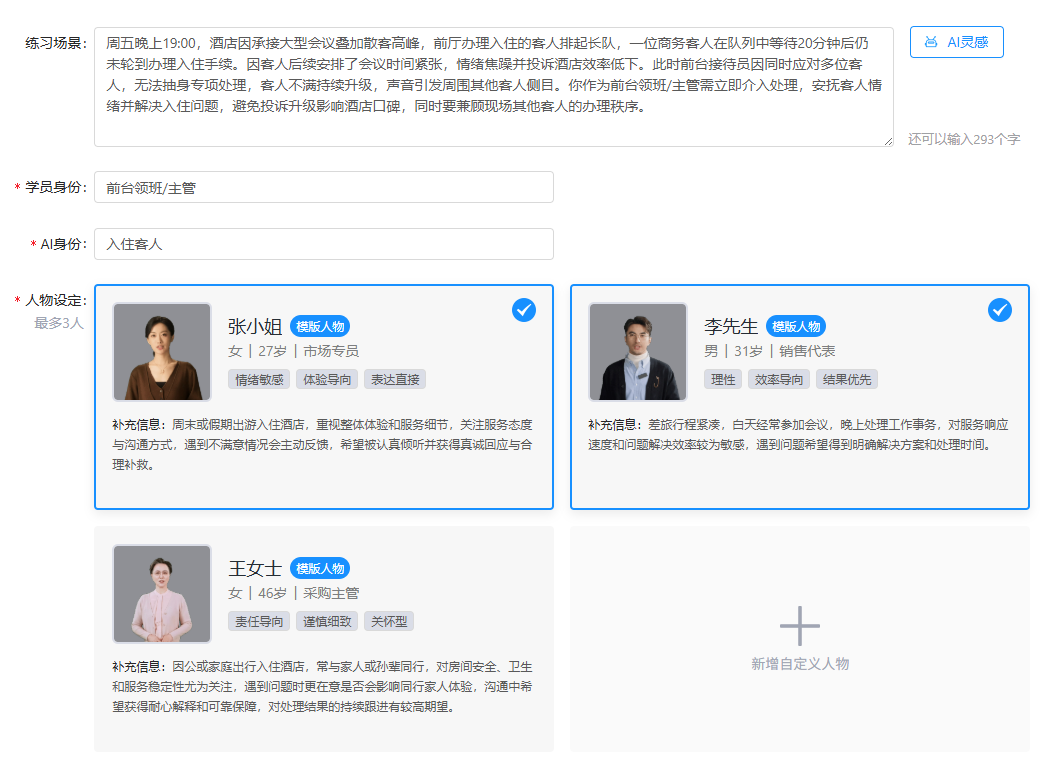 - 第二步,系统模板或AI辅助生成练习场景描述,可手动编辑,或通过AI优化,同步设置练习双方人物角色,并设置AI人物设定。人物设定可设置性别-形象-音色、称呼、年龄、职业、性格特点、人物背景等。每个练习可选择1-3名AI人物,学员练习时会依序面对选定人物。