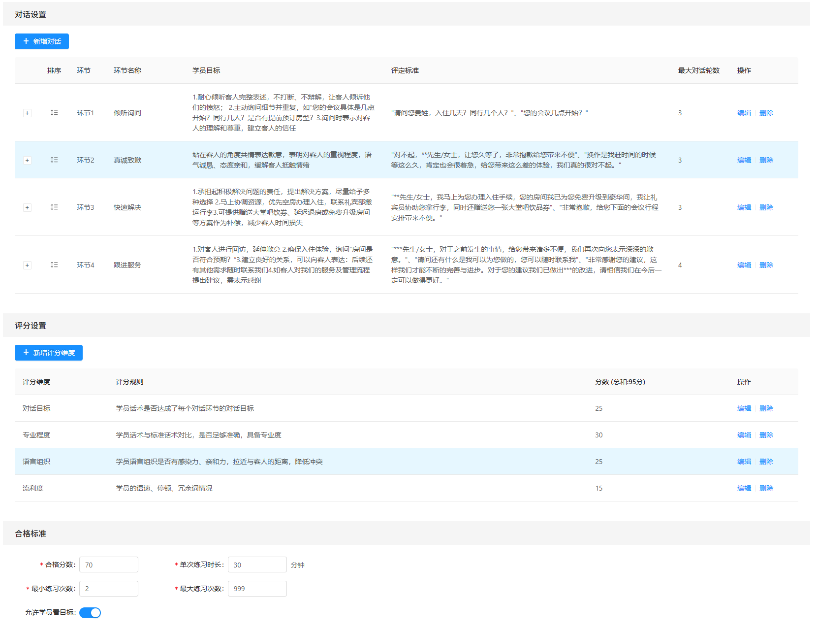 - 第三步,系统模板或AI辅助生成对话环节,每个环节学员需要达到的目标,以及评定达标的方式——AI智能判定或达成关键语句二选其一。如选择关键语句,则需要学员在当前环节基本复述全部的语句后才算作完成。最大对话轮数限制学员在该环节可以尝试的次数,如轮数用尽也未达到目标,则练习判定为未通过。每个环节可通过AI生成标准话术,供练习时AI进行模拟和参考,标准话术也可以手动添加和修改。