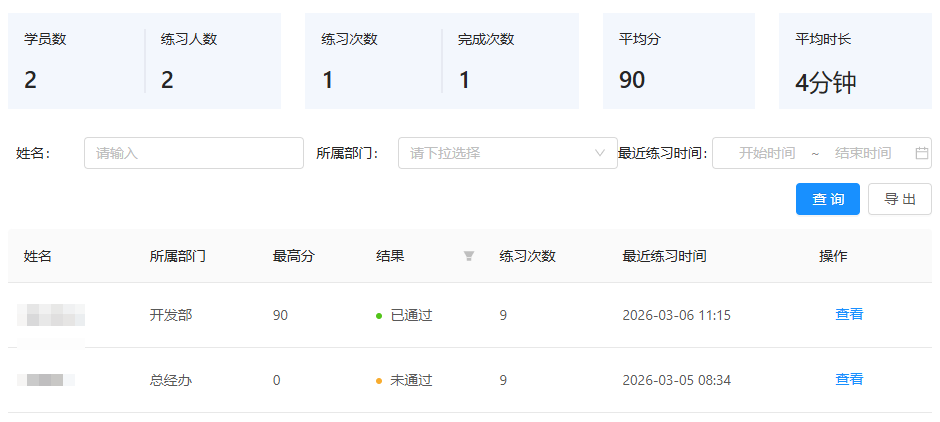 - 管理员可在统计里查看该练习的统计数据,学员当前是否参与练习、是否完成练习、练习最高分,可点击查看学员练习回顾,听语音和使用AI指导,并可查看和导出完成后的数据报告。